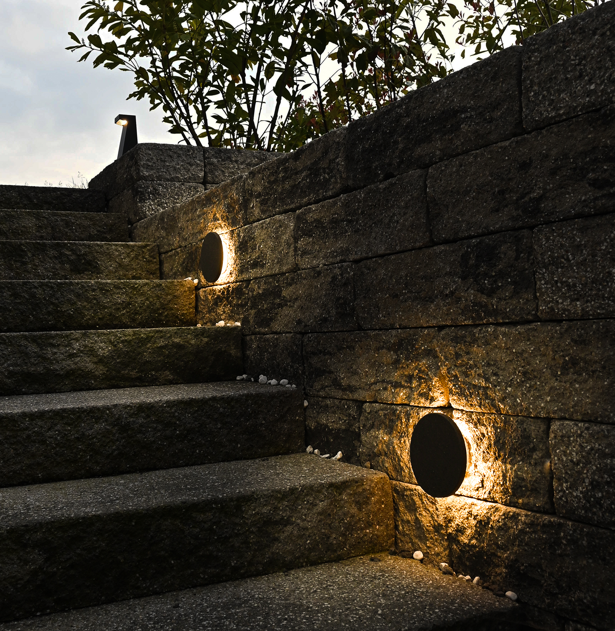 Eine abgestimmte Gartenbeleuchtung erzeugt beeindruckende Lichteffekte. Für einen Kunden entwarf einer unserer Lichtplaner ein wirkungsvolles Lichtkonzept für den Garten. Der Fokus der Planung lag dabei auf der Ausleuchtung der Treppe und der freistehenden Terrasse. Zum Einsatz kamen schlichte Wandleuchten mit abgeblendetem Licht, welche die Stufen gezielt beleuchten und so den Weg in den Garten weisen. Zur Beleuchtung der Terrassenfläche wurden Bodenaufbauleuchten installiert, die dafür sorgen, dass die Sitzgelegenheit und die Terrasse perfekt in Szene gesetzt werden.